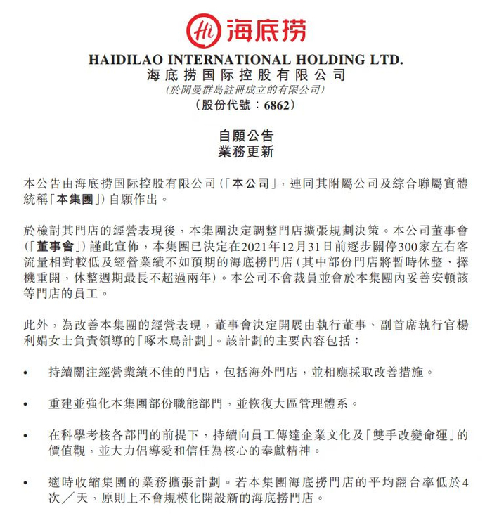 11月5日晚间,海底捞发布公告称,集团已决定在2021年12月31日前逐步关停300家左右客流量相对较低及经营业绩不如预期的海底捞门店(其中部份门店将暂时休整、择机重开,休整周期最长不超过两年)。公司不会裁员并会于集团内妥善安顿该等门店的员工。