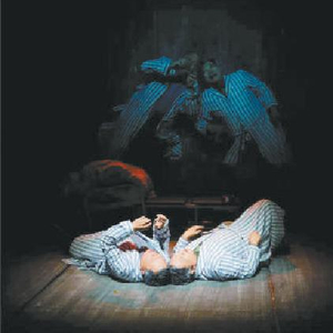 以长篇小说改编而成的舞台剧,原作中场景的转换和时空的跨越,或交由转台的使用,如《平台的世界》;或辅以叙述者,如《一句顶一万句》;再或就是影像的参与,如《两京十五日》。高志森导演的舞台上,立有三块巨型屏幕,用以交待角色所遭遇的爆炸,或是骑马奔腾、落水挣扎等场景。这看似解决了舞台上难以呈现、却又是小说中的关键情节,但是观众会觉得满足吗?就观演反响与效果而言,答案显然是否定的。即使暂且将情节取舍与改编立意搁置,也有观众在华丽的视听语言叙述中感受到了作品的“贫穷”。