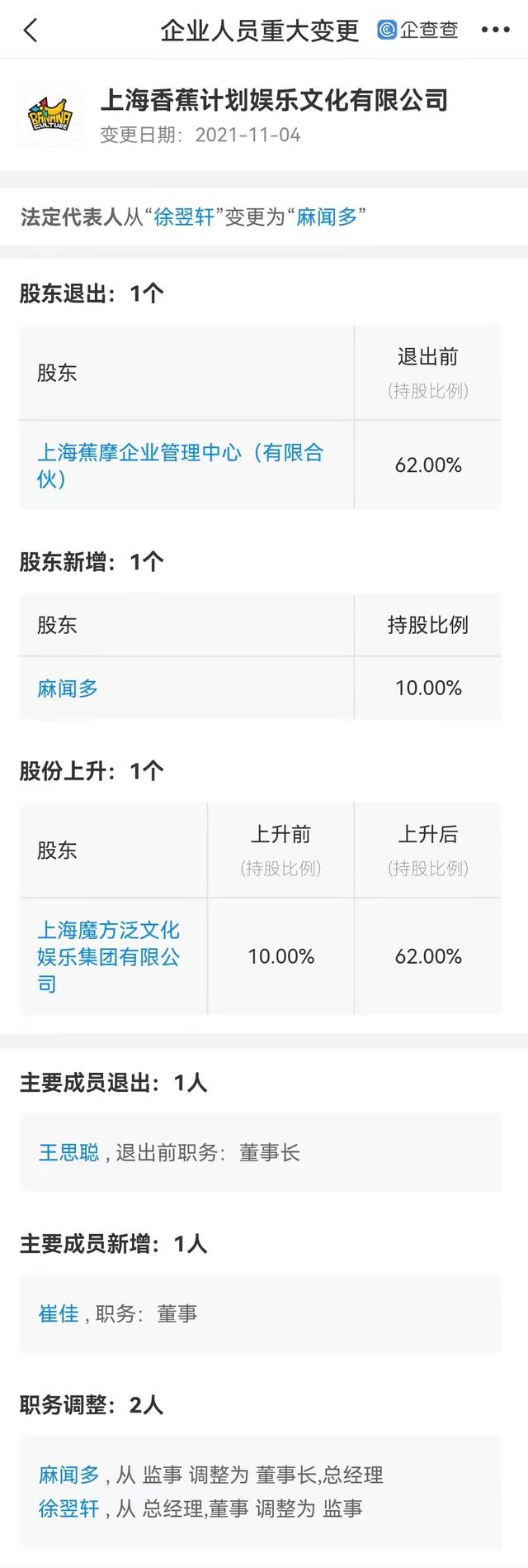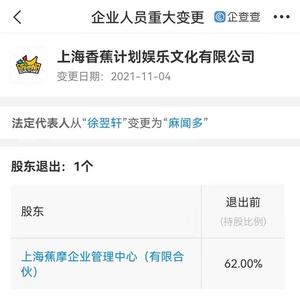 11月2日,香蕉娱乐关联公司上海香蕉计划娱乐文化有限公司发生工商变更,王思聪退出董事长职务,由麻闻多接任,同时法定代表人由徐翌轩变更为麻闻多。