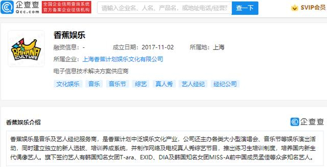 企查查信息显示,香蕉娱乐是音乐及艺人经纪服务商,公司成立于2017年,注册资本1000万元人民币,经营范围包含:演出经纪,摄影服务(除扩印),商务信息咨询等,现由上海魔方泛文化娱乐集团有限公司、王思聪、麻闻多、宁波梅山保税港区光挚源投资管理有限公司共同持股。