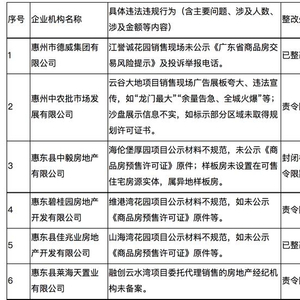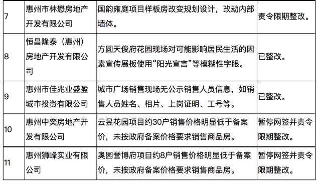 其中,惠州中奕房地产开发有限公司和惠州狮峰实业有限公司两家企业因销售价格明显低于备案价被暂停网签并责令限期整改。