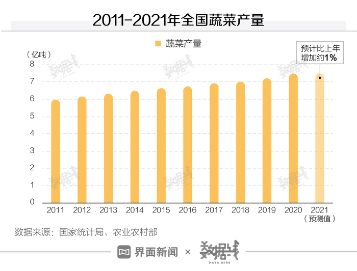 从产量来看,据农业农村部预计,今年全国蔬菜产量将达7.5亿吨,比上年增加约1%。结合此前数据,截至2021年,全国蔬菜产量已连续10年实现增长。