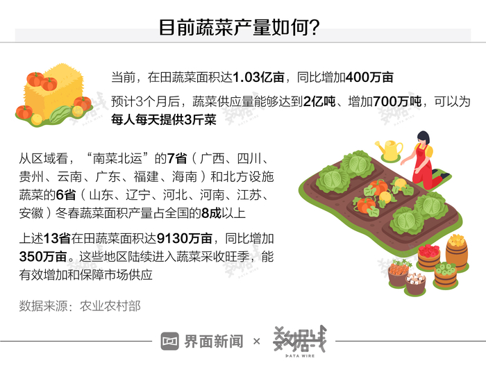 据农业农村部,预计未来3个月后,蔬菜供应量能够达到2亿吨、增加700万吨。也就是说,可以为每人每天提供3斤菜。同时,13个冬春蔬菜生产的“主力省份”在田蔬菜面积达9130万亩,同比增加350万亩,随着这些地区陆续进入蔬菜采收旺季,能有效增加和保障市场供应。