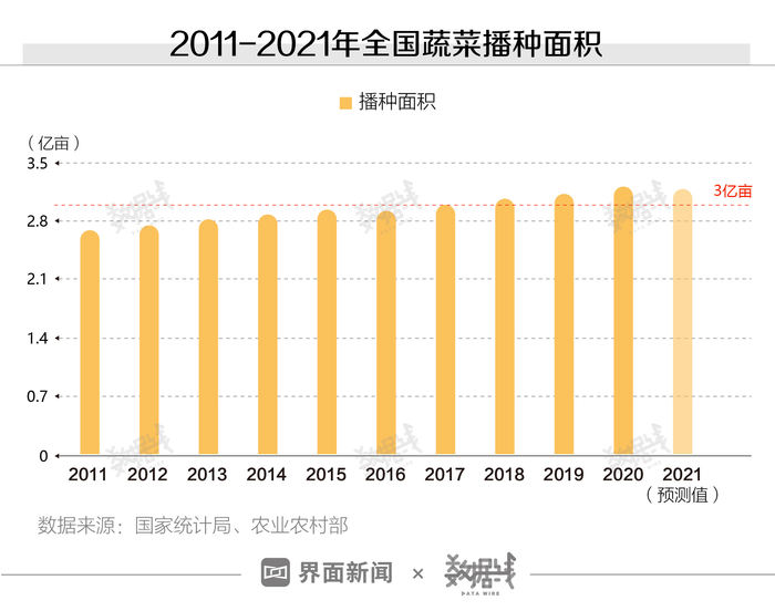 从播种面积来看,据农业农村部预计,今年全国蔬菜面积将达3.2亿亩。结合此前数据,2018年至2021年,全国蔬菜播种面积已连续4年超3亿亩以上。