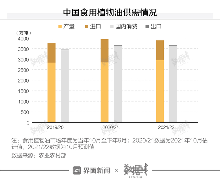 食用油也不缺。从结余量来看,据农业农村部10月发布的《中国农产品供需形势分析》,2020/21年度食用植物油结余量估计值为293万吨,2021/22年度食用植物油结余量预测值为229万吨。近期,主产区冬油菜陆续进入备播阶段。10月南方大部光温条件良好,有利于冬油菜育苗及后续移栽。