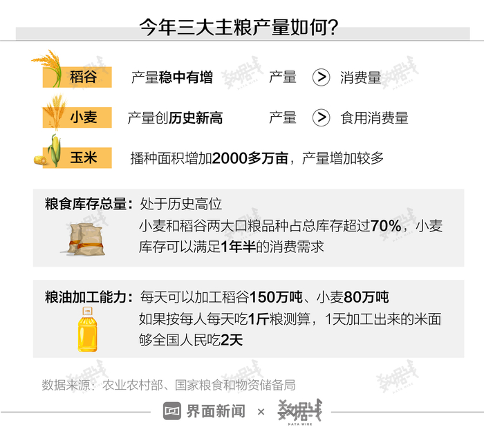 今年以来,三大主粮均实现增产。据农业农村部数据,今年稻谷产量保持稳中有增,小麦产量创历史新高,玉米产量也增加较多。从库存来看,小麦库存可以满足1年半的消费需求。从加工能力来看,1天加工出来的米面够全国人民吃2天。