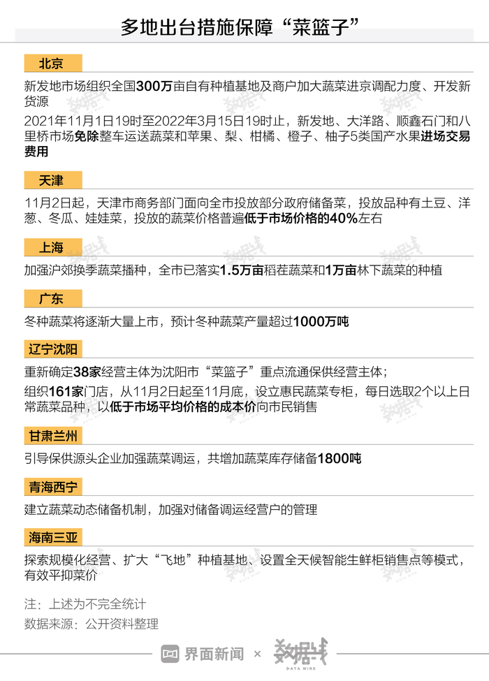 据界面数据不完全统计,目前全国多地出台措施,保障蔬菜等生活必需品供应。具体措施包括加大蔬菜调配力度,投放储备菜,免除部分批发市场的蔬菜进场交易费等。