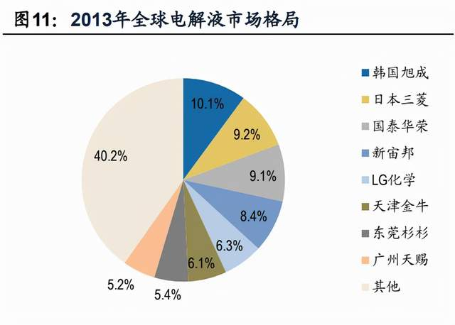 2000年左右,韩国吸收引进日本锂电技术,在财团助力下,LG化学、三星SDI、SKI等锂电池企业的崛起,拉动了韩国电解液厂商的市场份额。2009年,韩国超过日本成为全球电解液第一生产大国。2010年,韩国旭成超越宇部兴产成为全球第二大电解液厂商,仅次于三菱化学,2012年问鼎全球。
