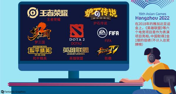王者荣耀亚运版本(Arena of Valor Asian Games Version)、英雄联盟、和平精英(亚运版)、炉石传说、刀塔2、梦三国2、街霸5和FIFA Online 4将作为正式竞赛内容亮相亚运会赛场。