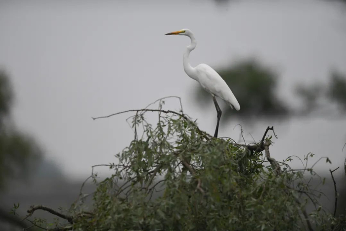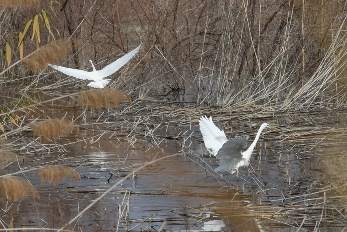 秋天的河畔塘边,柳林树梢,时有白鹭闲散地觅食,悠闲地栖息。