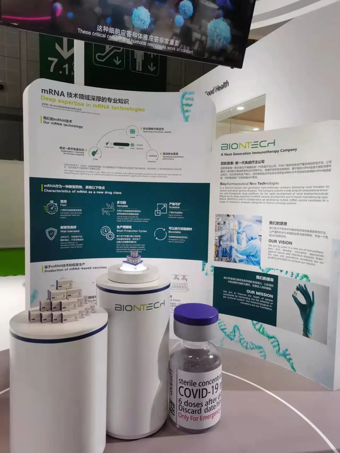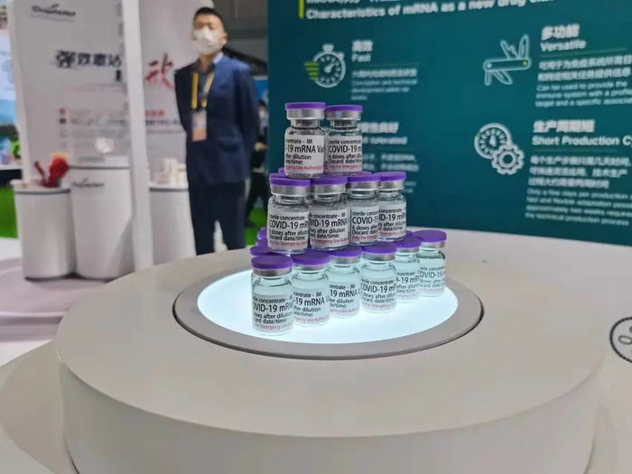 11月5日,进博会首日,澎湃新闻记者走访发现,作为全球四大疫苗巨头之一的默沙东,在主展台晒出了自家口服新冠治疗药物莫努匹韦的最新进展。复星在生物医药专区展示了与合作伙伴百欧恩泰(BioNTech)的mRNA新冠疫苗。相比去年仅仅以文字资料介绍,此次展示的疫苗是改良版的纸质包装盒和瓶身包装。