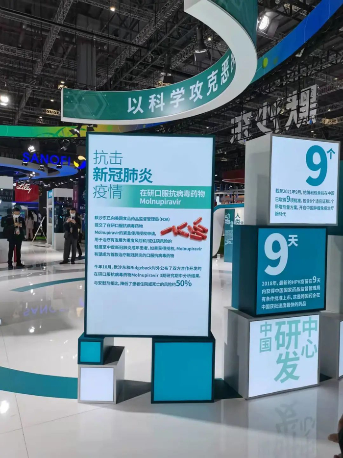 在进博会开展首日,默沙东的展台虽然未直接提及莫努匹韦英国获批的最新消息,也未展示真正的产品或者产品包装,但是在关键位置均介绍了该在研药物的信息。