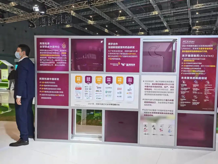 连续四年参展的阿斯利康,此次展台面积达到1100平米,是医疗器械及医疗保健展区占地面积最大的展台之一。在自身发展成果和联合政、产、学、研、医、投等跨界合作伙伴的成果展示之中,新冠疫苗淹没其中,而在进博会前的预热采访中,阿斯利康方面也并未强调。