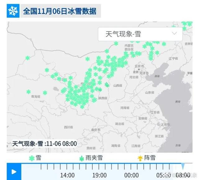 预计11月6日8时至7日8时,内蒙古、山西、河北、北京、天津、辽宁、陕西、河南等地的部分地区有大到暴雪,其中内蒙古中部、河北西北部、山西东北部等地局地有大暴雪(20~28毫米)。上述部分地区新增积雪深度5~15厘米,局地可达20厘米以上。