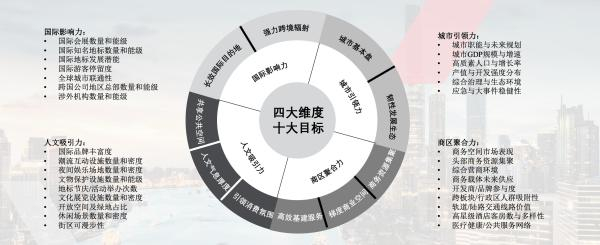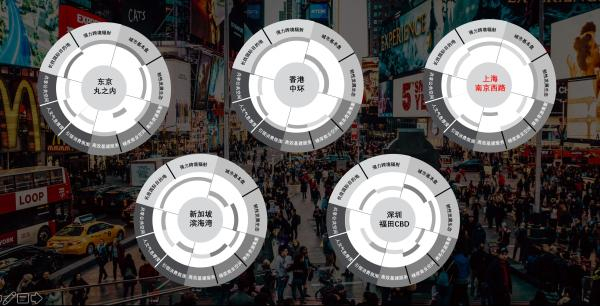 国际竞争力指数分为城市引领力、商区聚合力、人文吸引力、国际影响力4个维度,提出10大核心商区发展目标,并延伸出判定30项定性定量指标。该模型用于对上海南京西路、东京丸之内、香港中环、新加坡滨海湾和深圳福田5座亚太城市核心商圈进行了对比分析,南京西路在城市韧性发展生态和人文气息厚度上具有较强的国际竞争力。