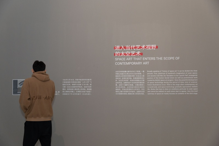 介入项目后,他开始补课,并且把自己的整理归纳也呈现在此次展览中。太空艺术的发展大致可以分为三个阶段:早期以绘画为主表达对外太空的想象;美苏太空竞争时期,前苏联《社会主义是发射台》这类的宣传画,美国成立“太空艺术项目”所创作的鼓励太空事业的作品。这期间,由于太空科技的强劲发展,出现了大量的科幻绘画;全球进入当代艺术阶段后,太空科技与现实生活日益贴近,开始出现借助外太空条件,去实现过往在地球上难以实现的创作。