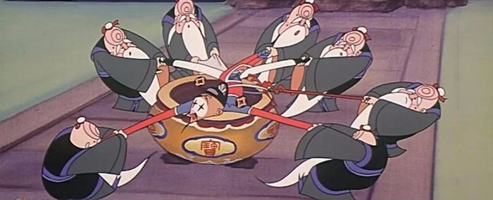 片中讽刺与喜剧效果达到高潮的一幕,就是县令从聚宝盆中捞出了九个老太爷,每个都大声叫着“我是你爸爸”,这便是在指出贪婪的恶果。