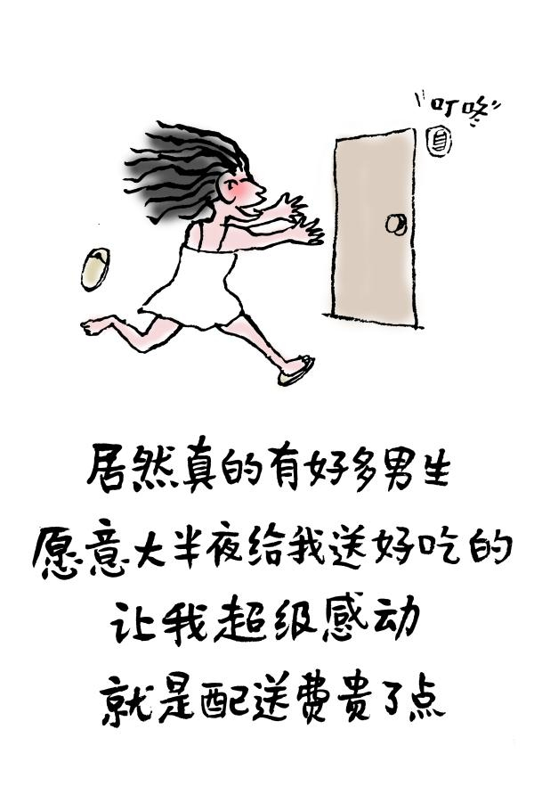 比如,“年底了,该吃吃该喝喝,体重别往心里搁”“今年夏天最大的希望是妈妈用菜刀切的西瓜不要有蒜味”“居然有好多男生愿意大半夜给我送好吃的,就是配送费贵了点”等。