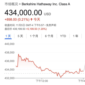 周五收盘,伯克希尔股价报434000美元,年初至今上涨了26%。