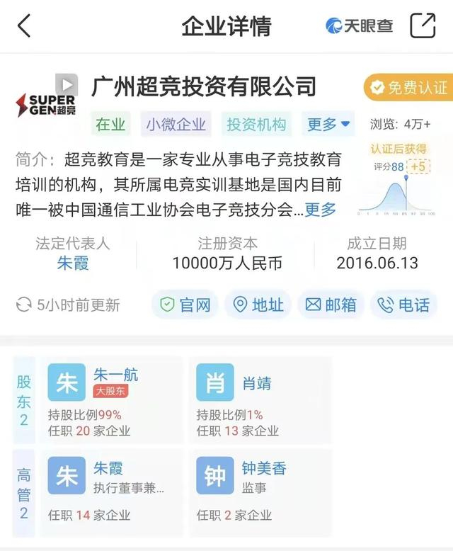 记者发现,EDG电竞俱乐部官方微信公众号的账号主体为上海阳川电子科技有限公司。根据天眼查显示,该公司成立于2011年,注册资本240万元,主要从事食品经营、演出经纪、广告制作、以及体育赛事策划等业务,该公司的大股东为广州超竞投资有限公司(下称“广州超竞”),而广州超竞背后的实际控制人为朱一航,持股99%。