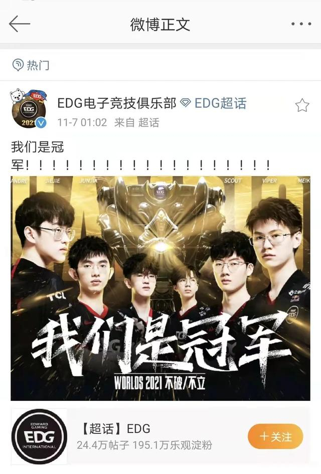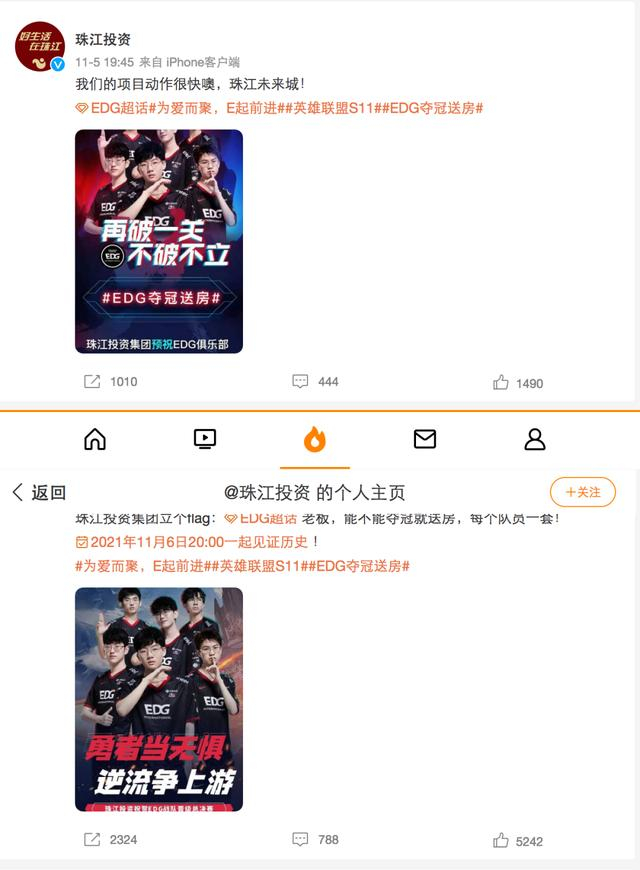 据认证为广东珠江投资股份有限公司官方微博的“珠江投资”,11月5日发文称,集团立个flag,老板,能不能夺冠就送房,每个队员一套。而且该微博文章中,带了#EDG夺冠送房#的话题。当日,珠江投资又再发了一条微博,“我们的项目动作很快噢,珠江未来城”,同样带了#EDG夺冠送房#的话题。至截稿时,关于EDG夺冠送房的话题,阅读量14.5万,讨论5508。