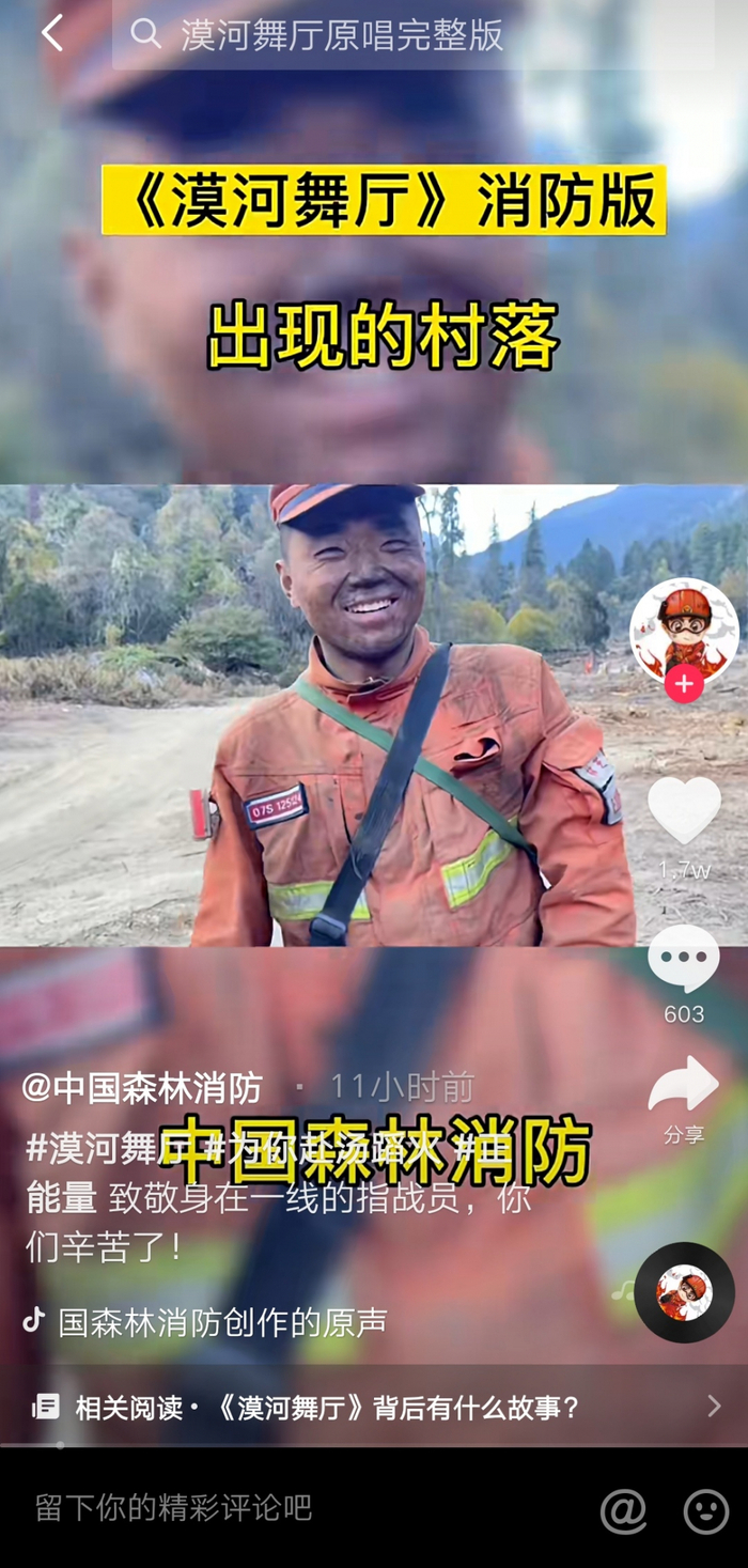 此外,这首歌受到持续关注也与一些官方账号的正向引导有关。《漠河舞厅》初有热度时,“漠河文体旅游局”等官方账号就发布了相关短视频,和网友分享漠河舞厅现在的样子,也介绍当地的特色文旅景观。基于这首歌曲的创作背景,也有不少消防系统的官方账号,把这首歌当背景制作短视频,宣传森林消防知识,网友也深深为消防官兵的奉献折服。有业内人士表示,这些官方发布的内容作出了正向的引导,吸引网友关注当地文旅资源,对促进当地的发展起到积极作用,一些公号提出的发散性话题也宣传了正能量。