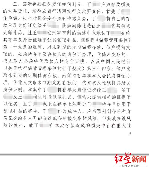 对于上述案件,上海大邦律师事务所律师游云庭向红星资本局分析称,“该案件最大的责任还是在储户个人”。