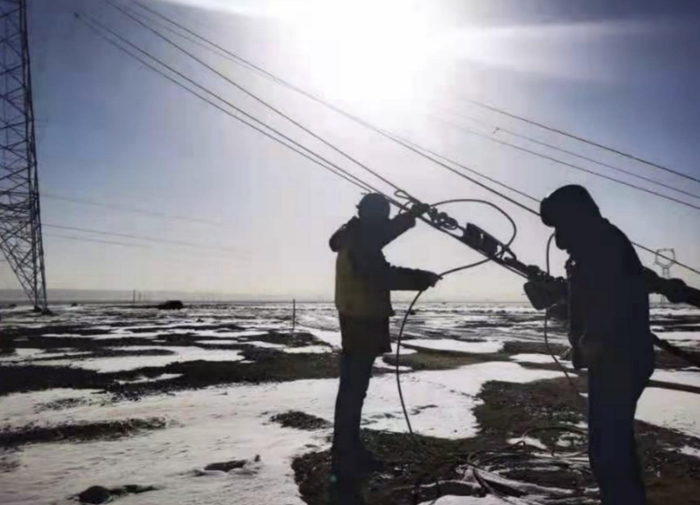 11月7日甘肃酒泉暴雪,寒潮来临,甘肃兰州供电公司倚能建设事业部员工超前部署应对雨雪冰冻灾害各项措施,全力保障电力供应。全面做好防寒潮、防雨雪冰冻等各项工作,并密切关注天气变化做好应急保电工作,积极做好防疫测温工作,甘肃兰州供电公司倚能建设事业部员工魏旭东、杨栋材在承建的甘肃酒泉风电基地二期第二批500万风电项目330千伏送出工程进行巡视、铁塔G32组立、铁塔G14铁塔检修工作。(金宏鸣 毛蕊)