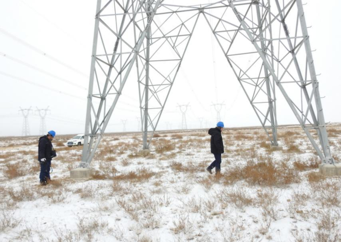 11月6日,内蒙古鄂尔多斯市突降大雪,国网蒙东检修公司鄂尔多斯市输电工区员工雪中巡视±800千伏昭沂线及500千伏盛昭Ⅰ、Ⅱ线。(王宁 郭剑飞)