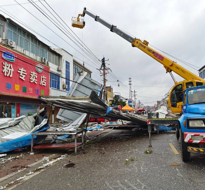 11月7日上午,安徽亳州利辛县受到寒潮大风天气影响,在该县10千伏王市大街06线出现异物砸线造成停电,利辛县供电公司员工冒风雨进行抢修送电。(刘喆)