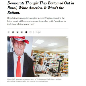 民主党人经常把他们的精力集中在摇摆不定的城市郊区和选民较多的城市,长期忽略倾向保守的白人农村社区。随着弗吉尼亚的选举失败,而民主党如今担心,情况可能会更糟,共和党人可能已经拥有了美国农村地区的铁票仓。