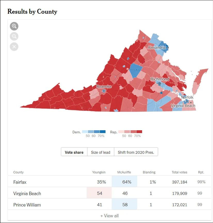而在具体县市投票方面,几乎全弗吉尼亚的乡村地区都“翻红”,支持杨金,只有诺福克、亚历山德里亚等少几个弗吉尼亚州大城市的居民更支持麦考利夫。出口民调显示,杨金以70%的选票在弗吉尼亚州的山区获胜,高于特朗普去年在总统大选中获得的63%的选票。
