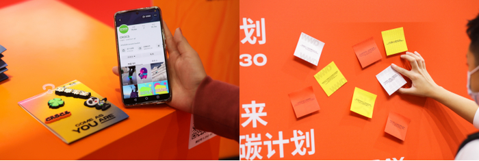 扫码关注获得限量进博会智必星(左图)/可持续发展宣言墙(右图)