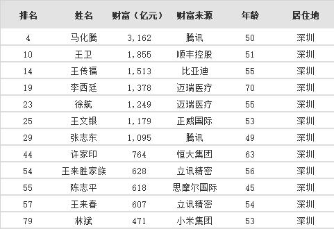 再来看深圳上榜富豪名单(12位)↓