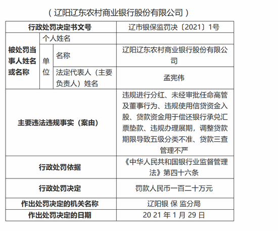 值得注意的是,辽阳辽东农商行不仅面临股权质押的问题,其内控管理也存在风险。根据银保监会披露的信息,辽阳辽东农商行于今年年初收到过高达120万元的罚单。辽阳银保监分局行政处罚信息公开表显示,辽阳辽东农商行因违规进行分红、未经审批任命高管及董事行为、违规使用信贷资金入股、贷款资金用于偿还银行承兑汇票垫款、违规办理展期,调整贷款期限导致五级分类不准、贷款三查管理不严的违法违规事实,被处以罚款120万元。