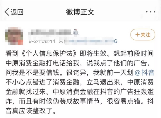 记者注意到,今年5月10日,国家网信办发布的一则通报显示,48款网络借贷App被点名违法违规收集使用个人信息,其中就包括中原消费金融-贷款借钱APP。通报显示,该APP存在未经用户同意收集使用个人信息、收集与其提供的服务无关的个人信息等违规行为。10月中旬,抖音平台也因为发布某金融视频广告,宣扬过度消费等不正确导向,存在严重价值观问题被罚。就贷款营销等相关问题,记者分别联系了上述两家机构,截至发稿,未收到正面回复。