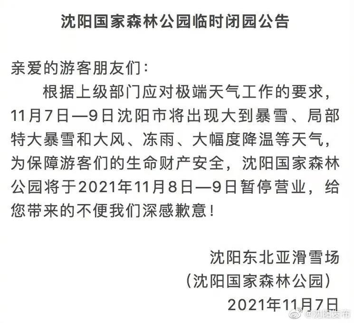 根据沈阳市应急办最新通知,为应对我市11月7日—9日将出现的历史罕见大暴雪、局部特大暴雪和大风、冻雨、大幅度降温等天气,沈阳故宫、清福陵(东陵公园)、清昭陵(北陵公园)11月8日、11月9日临时关闭,特此公告。沈阳故宫博物院2021年11月7日