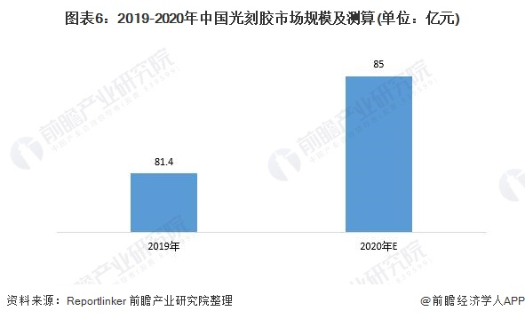 据Reportlinker的统计数据显示,2019年,中国光刻胶销售额达到人民币81.4亿元,若按美元兑人民币汇率(1:6.5)计算,中国的市场规模几乎占全球总量的15%;2020年,前瞻根据全球市场规模及占比(15%)进行测算,我国光刻胶市场规模约为85亿元。