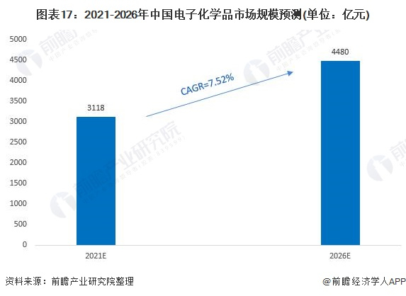 未来,5G、新材料研发等进程将进一步推动通讯设备、手机和可穿戴设备等消费电子、汽车智能化、家电智能化领域的快速发展,带动电子产业进入新一轮增长周期,从而带动电子化学品需求的快速增长。因此,预计中国电子化学品市场规模将保持持续增长趋势,结合市场规模历史增长率,预计到2026年,中国电子化学品行业市场规模达到4480亿元。