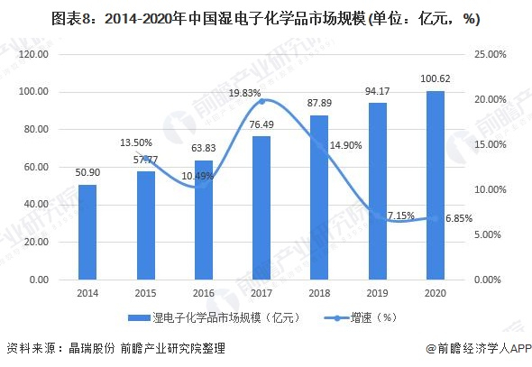 随着产量与需求量的增加,我国湿电子化学品市场规模也逐年上升,2014-2020年我国湿电子化学品市场规模呈现上涨趋势,2020年我国湿电子化学品的市场规模约为100.62亿元,同比增长6.85%。