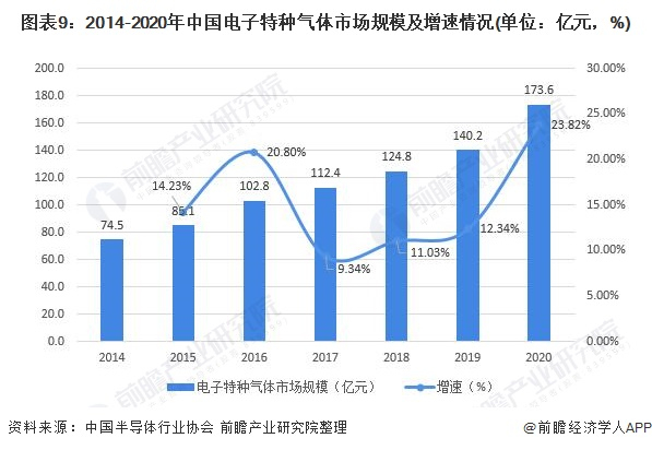 电子特种气体(简称电子特气)是特种气体的一个重要分支,是超大规模集成电路(IC)、平面显示器件(LCD、LED、OLED)、太阳能电池等电子工业生产不可或缺的原材料。随着我国高新技术的快速发展,计算机工业对大规模集成电路的需求,对液晶显示器的需求大量增加;随着新型能源的发展,我国大力开拓了多晶硅太阳能电池和薄膜太阳能电池的生产;此外,新型电光源、光电半导体器件、光纤通讯器件也获得迅猛发展,在上述高新产品的生产中,都需要大量高纯气体,以制造出性能可靠的各种器件。根据中国半导体行业协会公布的数据,2014-2020年我国电子特种气体市场规模呈现增长趋势,2020年我国电子特种气体行业销售规模约为173.6亿元,同比增长23.82%。