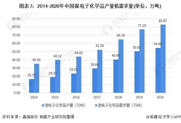 在供应和需求方面,根据晶瑞股份公告披露信息及公开信息,2014-2020年我国湿电子化学品产量和需求量均呈现增长趋势,2020年我国湿电子化学品产量约为54.68万吨,需求量约为82.87万吨,国内湿电子化学品供应量明显少于需求量。