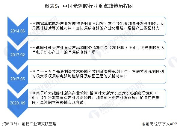 光刻胶是利用化学反应进行图像转移的介质,主要原材料为树脂、溶剂及其他添加剂等。光刻胶行业是我国重点鼓励发展的电子专用材料制造产业,是支撑经济社会发展和保障国家安全的战略性和基础性产业,2014年以来,推动我国光刻胶行业的重点政策如下: