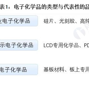 电子化学品是电子工业中的关键性基础化工材料,电子工业的发展,要求电子化学品与之同步发展,不断地更新换代,以适应其在技术方,面不断推陈出新的需要。按照统计分类,电子化学品一般根据用途分为基板、光致抗蚀剂(国内称光刻胶)、保护气、特种气、溶剂、酸碱腐蚀剂、电子专用黏结剂、辅助材料等。一般情况下,电子化学品主要组成为光刻胶、电子特种气体、电子封装材料、高纯试剂和其他电子化学品等。