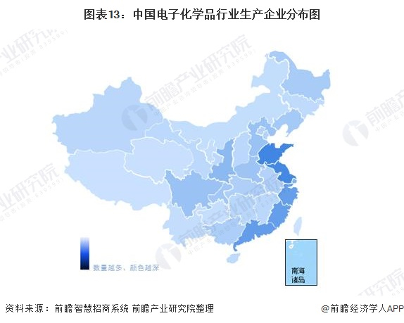 根据前瞻智慧招商系统,截至2021年7月19日,中国电子化学品行业注册资本1000万以上在业或者存续企业数量约为7.7万余家。从中国电子化学品行业企业分布图中可以看出,目前中国电子化学品行业主要聚集在长三角、珠三角地区,具体集中省份为江苏省、山东省、广东省、浙江省和福建省等。