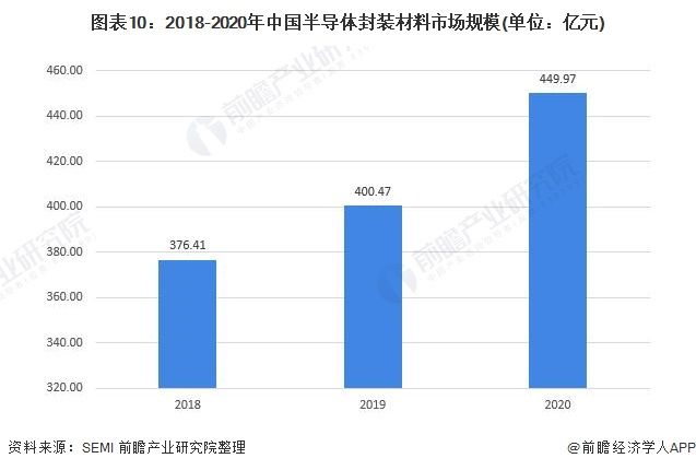 根据SEMI统计数据,2012-2020年期间我国大陆半导体材料市场规模总体呈波动增长态势,并且我国的半导体材料仍然集中在后端封装材料上,封装材料的市场占比约为半导体材料中市场的66.82%。由此测算得出2020年我国大陆半导体封装材料的市场规模约为65.22亿美元,按年均汇率折合人民币约449.97亿元。