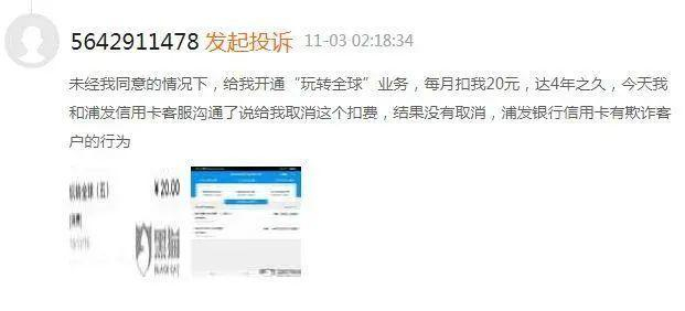 “未经我同意的情况下,浦发银行给我开通‘玩转全球’业务,每月扣我20元,达4年之久。”一名消费者在投诉平台上反映。而浦发银行被投诉的隐藏消费中,还包括了“玩转分期”、“健康管家”、“福袋”等收费项目。