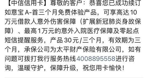近日,有消费者反映,自己收到中信银行短信提示,称自己的信用卡续订了付费服务,但这项服务是何时订购、如何订购的,自己却毫不知情。