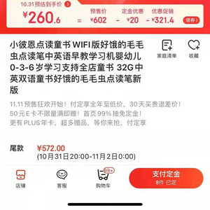 杜女士说,今年“双十一”活动期间,她打算给孩子买一款点读笔。10月20日,宝妈群里有人发消息称,京东商城小彼恩点读童书旗舰店有特价活动。商品页面显示,预售价602元的点读笔,支付10元定金后,10月31日支付剩余尾款,算上定金优惠、优惠促销等活动,预估到手价仅为260.6元,“当时我们群里很多人都付定金买了,觉得价格还挺优惠的”。