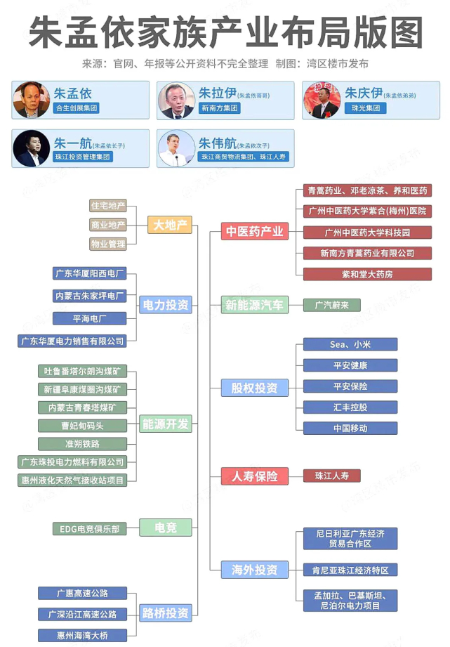 从地产发家,朱家又创立珠光集团、珠江投资、新南方集团,触角遍及中医药、电力开发、能源开采、路桥建设、保险人寿等十大产业。朱孟依、朱拉依、朱庆伊三兄弟及其子女名下的公司,结成了隐秘而庞大的“珠江合生系”。